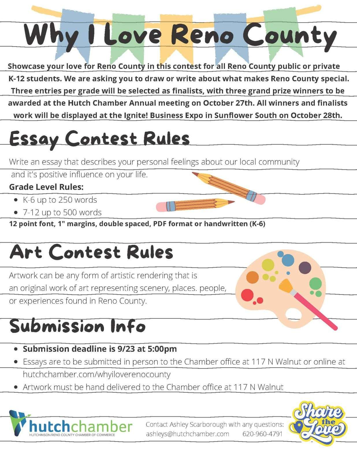 Submissions are due to the Hutchinson/Reno County Chamber office at 117 N Walnut or online at hutchchamber.com/whyiloverenocounty no later than 5 p.m. on September 23, 2022. Artwork must be hand delivered to the Chamber office.