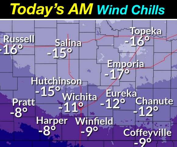 Very cold wind chills are expected. Wind chills as low as 20 below zero in isolated portions of Central and South Central Kansas. The very cold wind chills could result in frostbite or hypothermia if precautions are not taken.