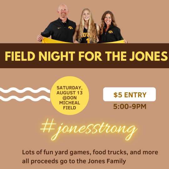 The Hutchinson High School DECA group will be hosting a Field Night for the Jones Family on August 13th from 5:00 p.m. to 9:00 p.m. at Don Michael Field in Hutchinson. Entry fee will be $5. There will be lots of fun games to play and a cornhole tournament.