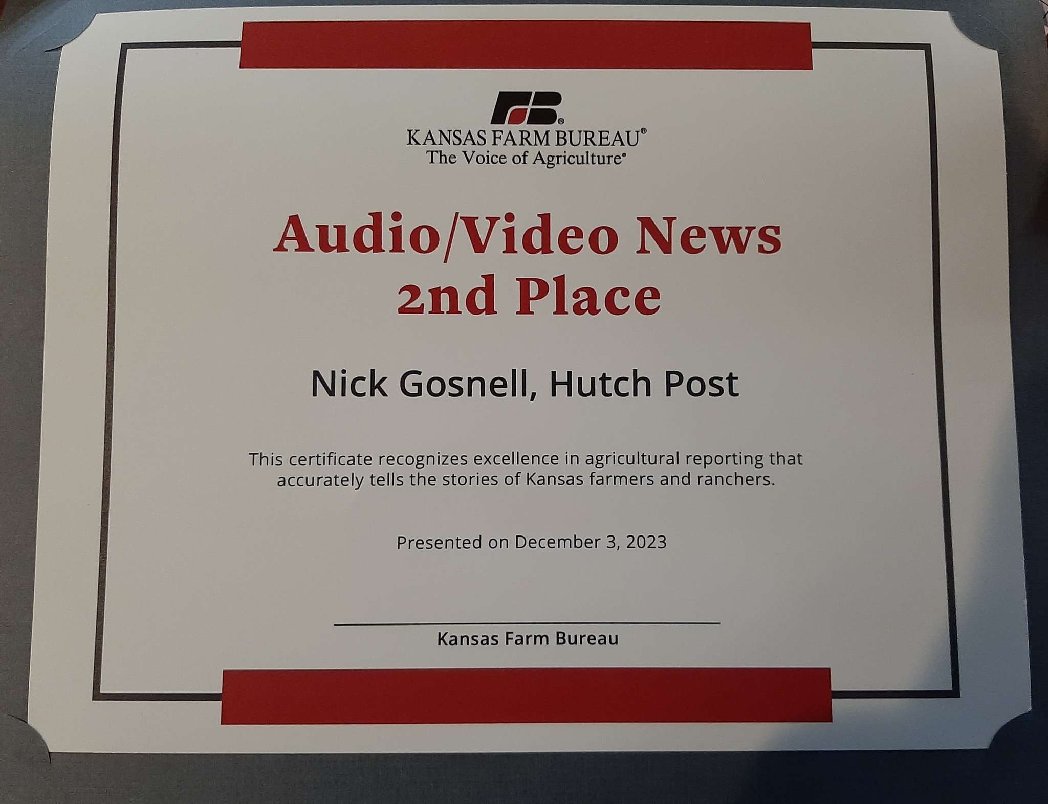 HUTCHINSON, Kan. — Eagle Radio's own Nick Gosnell was awarded by the Kansas Farm Bureau for a second-consecutive year. This year, Gosnell placed second in the audio and video news category of the third annual agricultural reporting award competition this month.