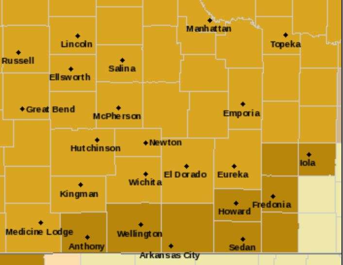 Southwest winds sustained from 40 to 50 mph with gusts up to 70 mph are expected over portions of central, south central and southeast Kansas.