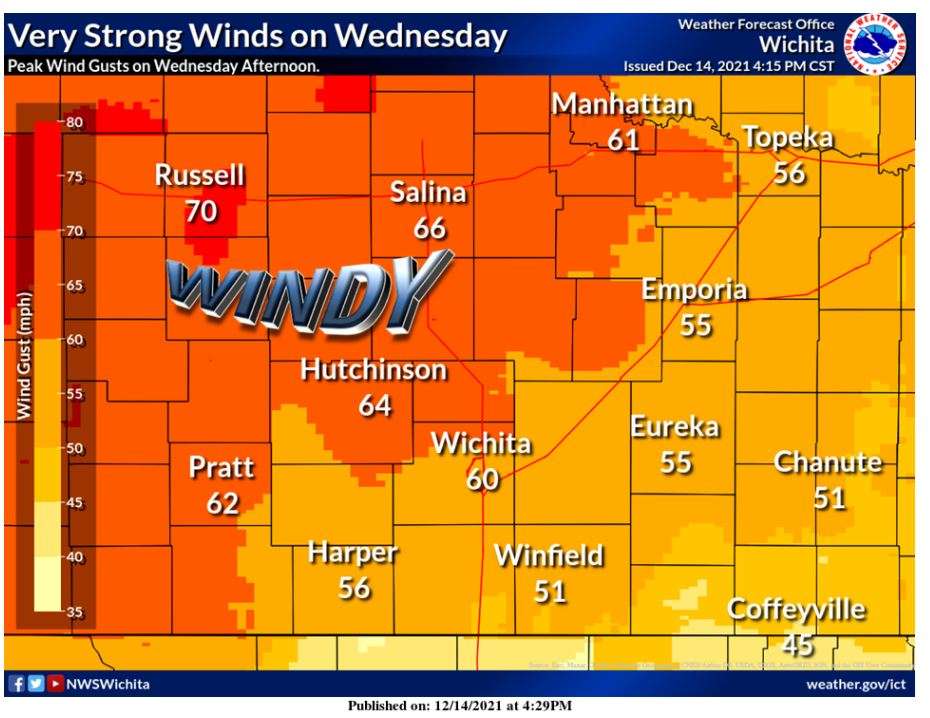 Highest gust as of 4:34 p.m. is 84 mph at the Hutchinson airport.
