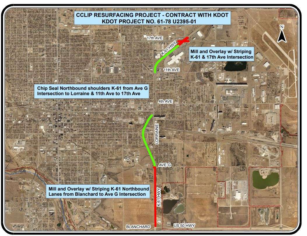 "The City applied for the CCLIP program with the state a couple of years in a row," said Jeff Schenk with Engineering. "We were awarded on July 15, 2020 and July 19, 2021, two separate projects. One of them was to redo the 17th and 61 intersection. The participating part is the section inside of the state right of way. Then, we were also going to extend onto 17th, which was done the last time we did this project, which will extend from Waldron Street to the railroad tracks just east of Walmart. That section is considered non-participating. We cover all of that, but it's bid at the same time. It comes out of our arterial budget. We were awarded that one. The second one is doing northbound only K-61 from US 50 to Avenue G and then the Avenue G and K-61 intersection."