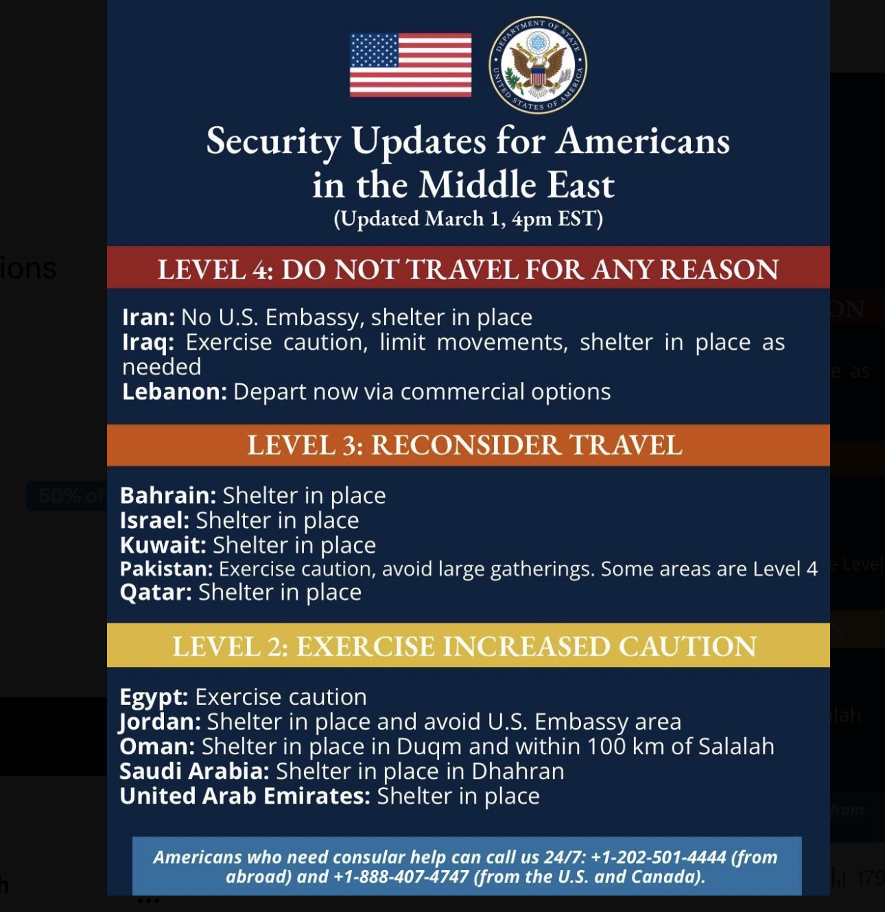 U.S. embassies in the Middle East updated security advisories for Americans traveling and residing in these regions to exercise caution amid the ongoing Iran conflict, according to the Department of State Consular Affairs.