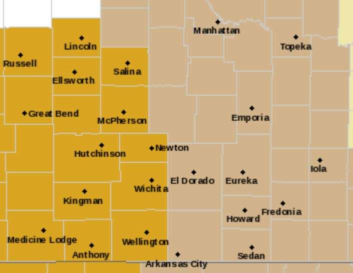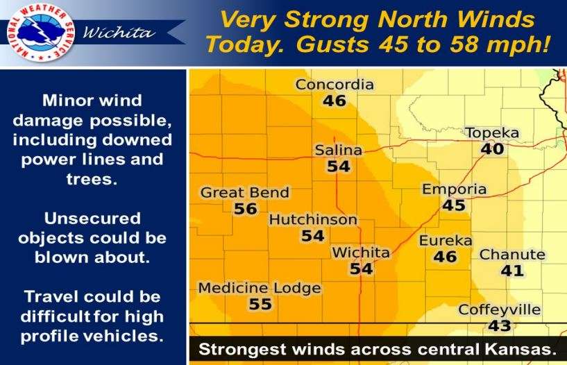 North to northwest winds 30 to 35 mph with gusts to around 58 mph are expected in portions of Central and South Central Kansas until 7 p.m. this evening.