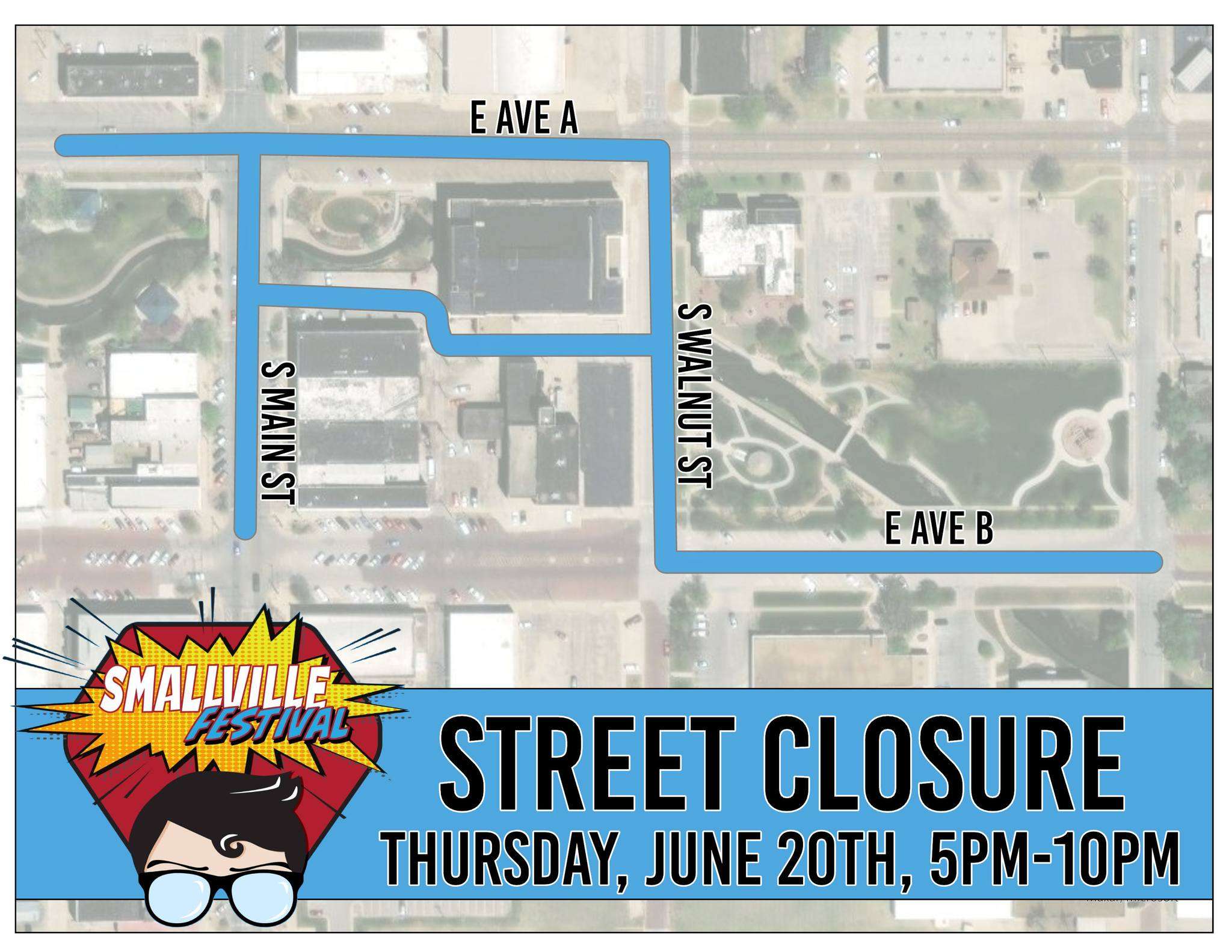 Thursday, June 20th, 5:00 PM - 10:00 PM:-Walnut Street from Avenue A to Avenue B-Main Street from Avenue A to Avenue B-Avenue A half a block west of Main to Walnut Street-Avenue B from Walnut to Poplar Street