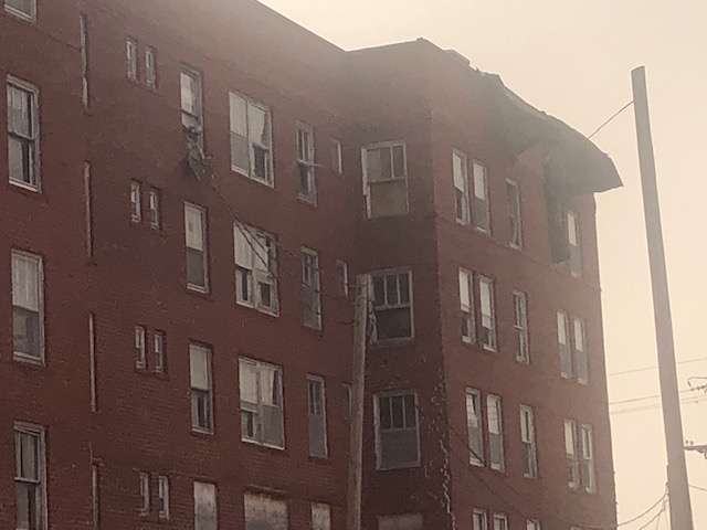 Portions of the roof including a large amount of fabric from the roof separated from the building forcing Hutchinson Fire to close the street. Pieces of the roof were on Main street and 5th Avenue during the afternoon. A number of windows are also missing from the building although its hard to tell how much of that damage is new.